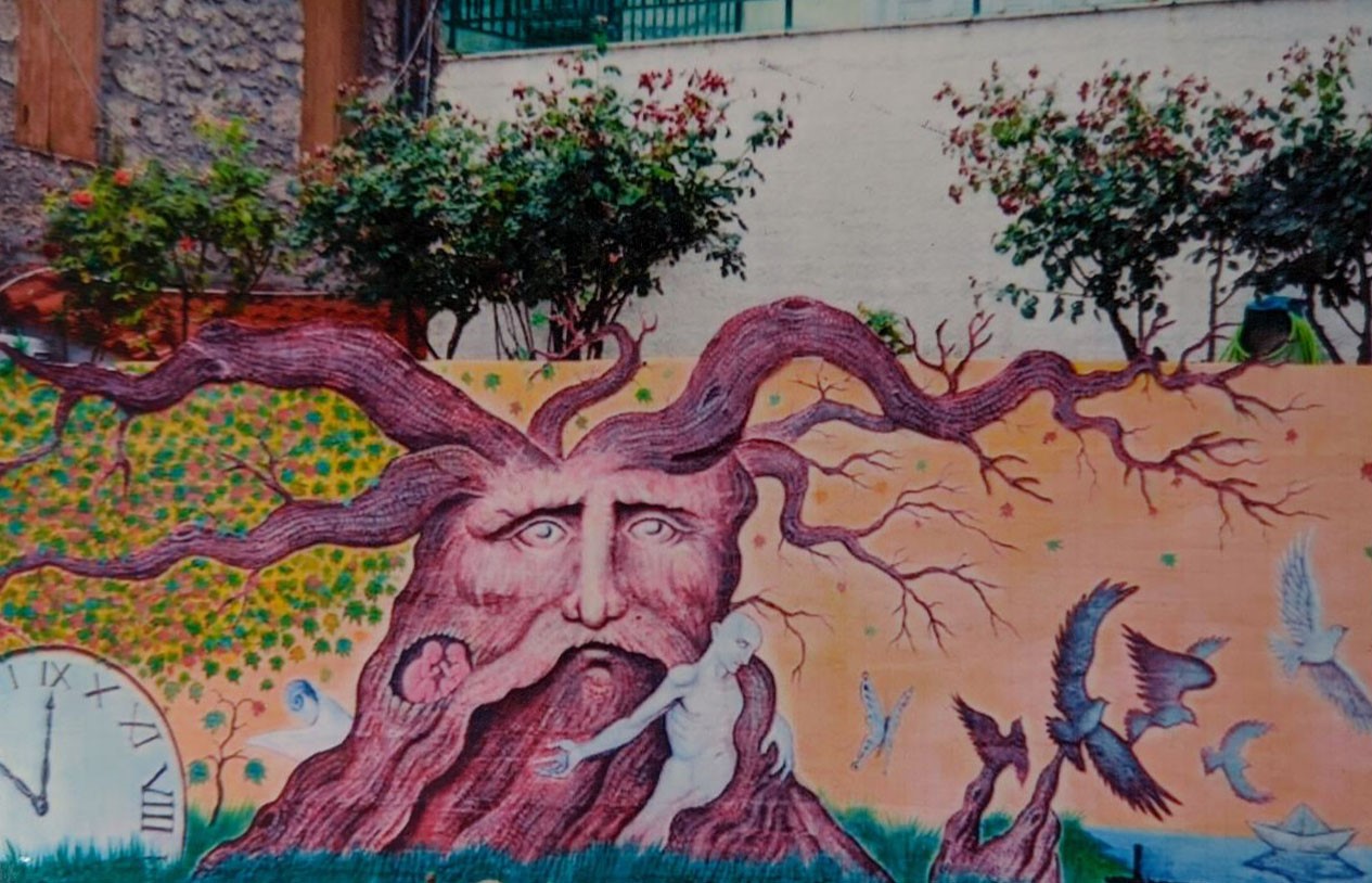 Σε μια κοιλότητα του κορμού χαμηλά, δύο έμβρυα, αρσενικό και θηλυκό εκκολάπτονται και μεγαλώνουν. Είναι η χαρά της ζωής και γι’ αυτό τα κλαδιά του, από αυτήν την πλευρά, έχουν έντονη ανθοφορία και ζωηρό το πράσινο χρώμα της ελπίδας.